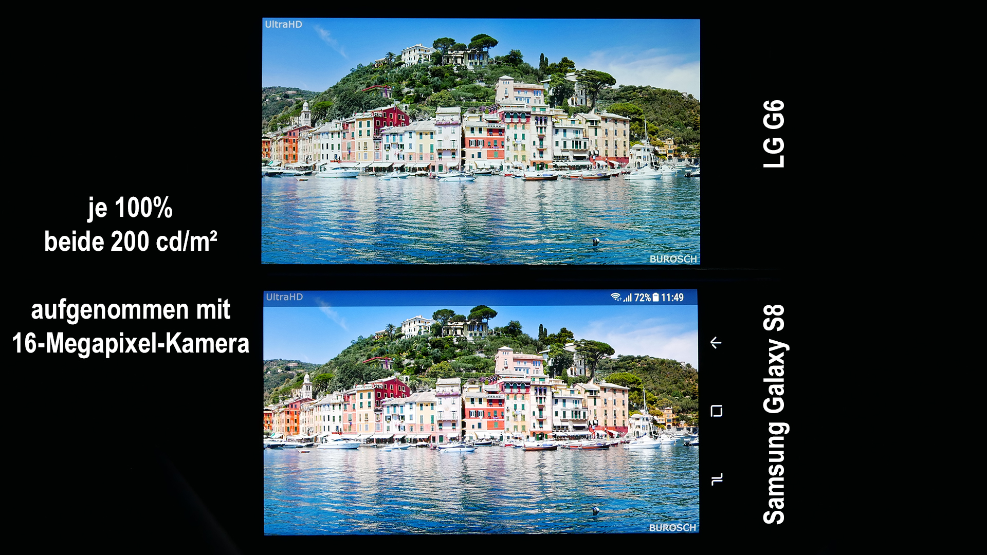 Wie schlägt sich also die Darstellung des G6 im Vergleich zum S8? Das demonstriert dieser Vergleich, bei dem ein 4K-Foto auf beiden Geräten mit einer 16-Megapixel-Kamera aufgenommen wurde während die Helligkeit jeweils bei 200 Candela lag.