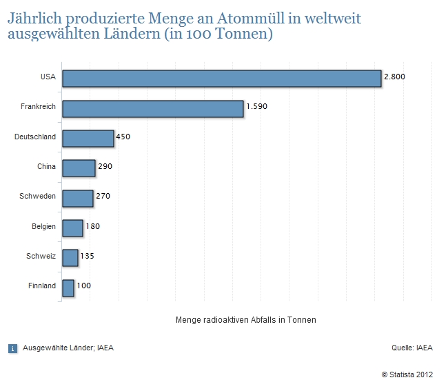 - Jährlich produzierte Menge an Atommüll in weltweit ausgewählten Ländern (in 100 Tonnen)