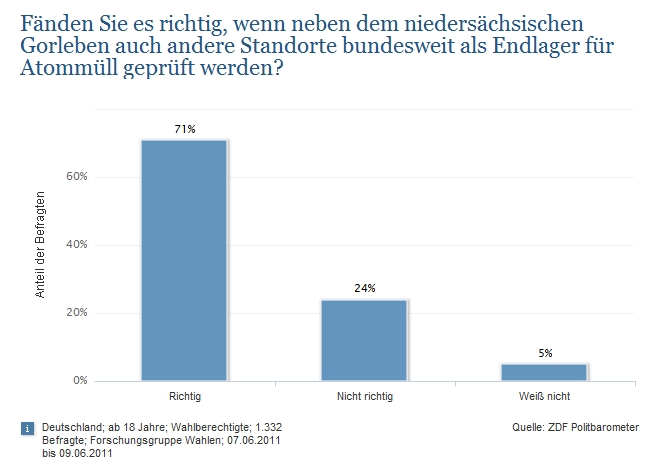- Umfrage: Fänden Sie es richtig, wenn neben dem niedersächsischen Gorleben auch andere Standorte bundesweit als Endlager für Atommüll geprüft werden?